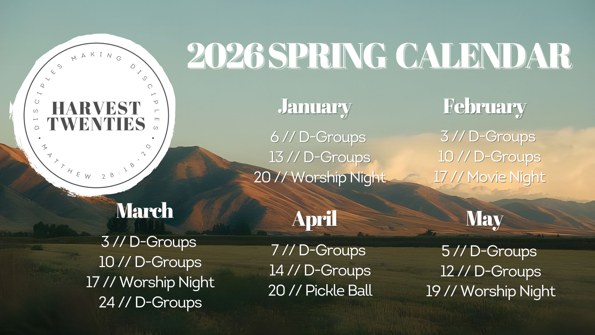 20s discipleship groups (d-groups) are for those who regularly attend Harvest Fremont. Groups meet from fall through spring to apply biblical teaching, to encourage and challenge one another, and to join in accountability. Click below to get connected.