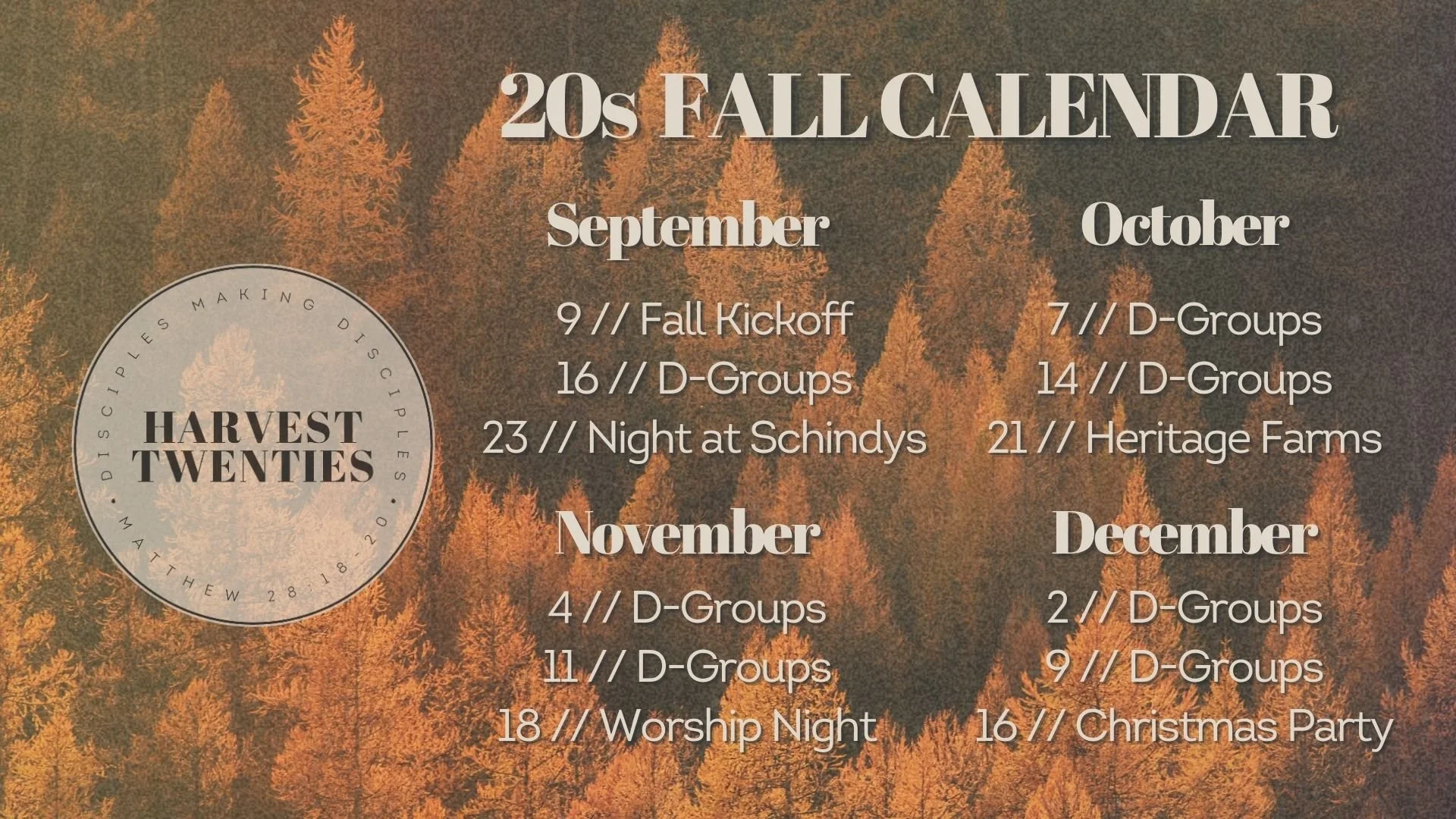 If Harvest is your home church, and you are between the ages of 18-29, get connected with the 20s ministry today! Join us for discipleship groups that will meet from fall through spring to apply biblical teaching, to encourage and challenge one another, and to join in accountability. If you are a college student, young professional, dating, single or engaged, this ministry is for you. Join others in your same stage of life desiring to bring Jesus glory in every decision.
