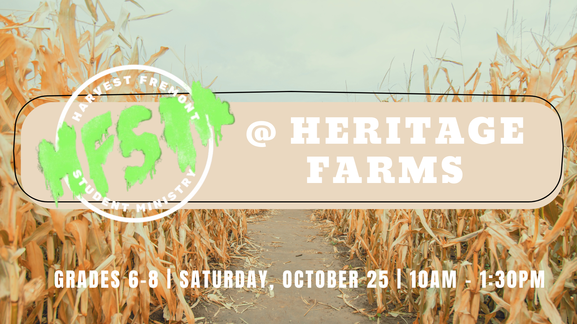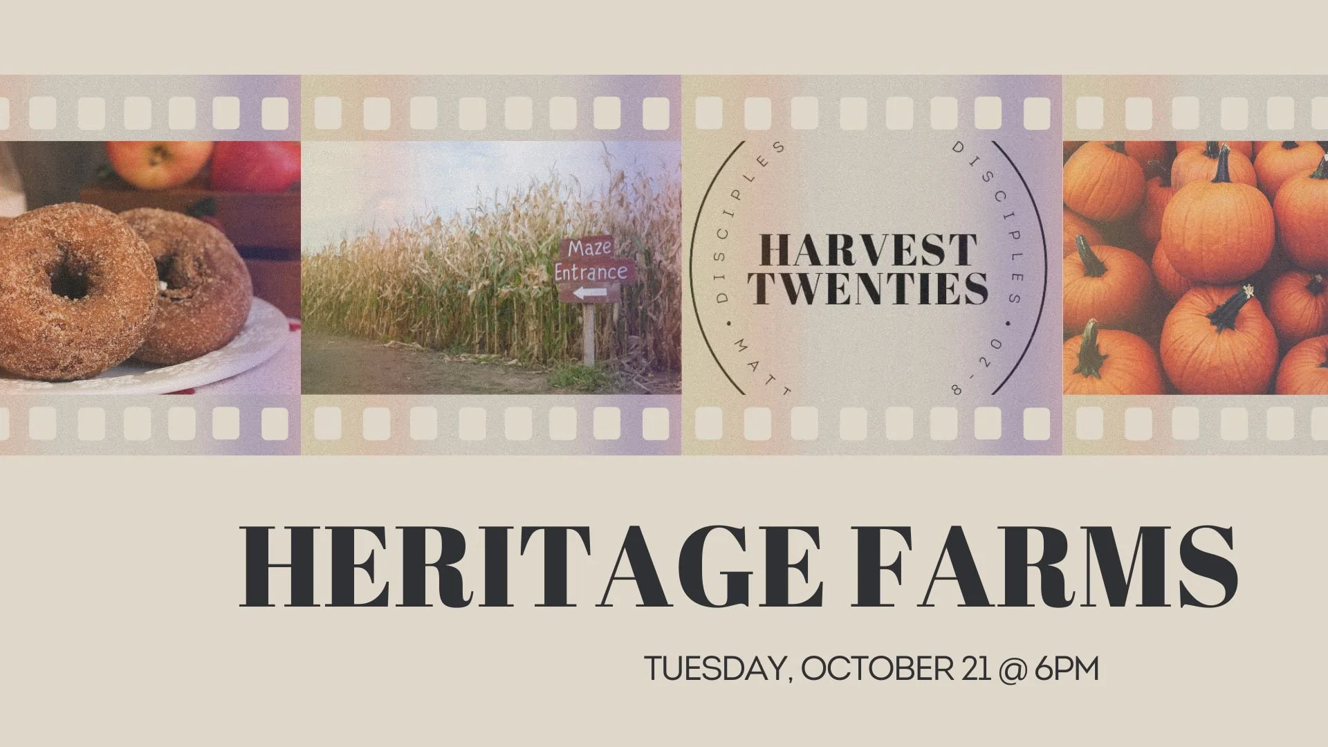 Join the Harvest 20s at Heritage Farms on Tuesday, October 21. Whether you are part of a 20s d-group or not, you are invited! Grab some warm apple cider and pumpkin donuts while you adventure through the corn maze during this night of fun with others in your same stage of life.